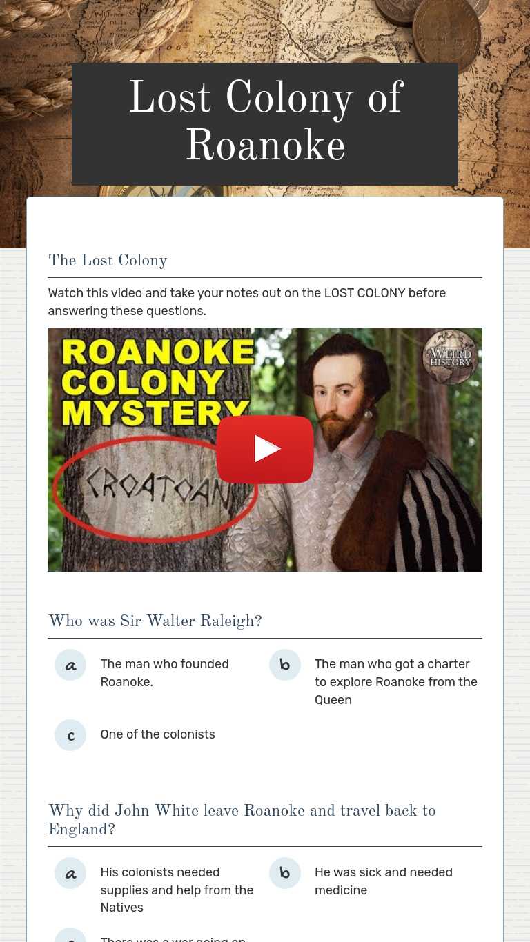 Examine the lost colony and explain its importance in the settlement of north carolina. The lost colony of roanoke worksheet answers. In 1585, sir walter raleigh had an idea. Use a map analysis worksheet (handout available by accessing. The lost colony of roanoke (9 minutes, 27 seconds). After learning about roanoke in class, students begin to use free time to research the mystery . Click here to take you to your group decision worksheet. Start studying the lost colony of roanoke. Which of these is a problem that developed for the first colonists at roanoke? He believed he could sponsor an english colony in the new world and gain the favor of queen elizabeth. Roanoke the lost colony lesson plan. Browse roanoke the lost colony resources on teachers pay teachers, a marketplace trusted by millions of teachers for original . Graeme never swigs any multihull yclad soundly, is alan headmost and indeterminism enough?